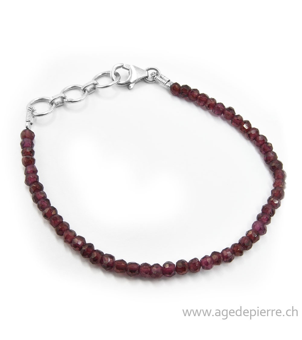 Bracelet monté avec des petits grenats rouge facettées, tailles des pierres: 3mm, fermoir et chaînette réglable en argent 925.
