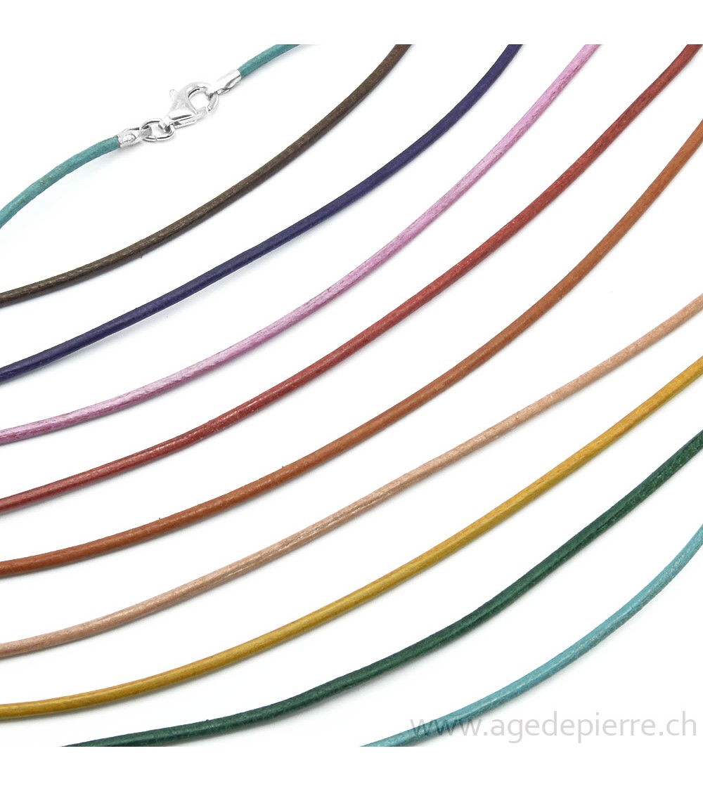Cordon en cuir avec fermoir en argent titré 925 en 42 cm et 45 cm de long. Vous pouvez consulter la rubrique ci-dessus pour voir les couleurs et nous transmettre par écris votre tailles désiré