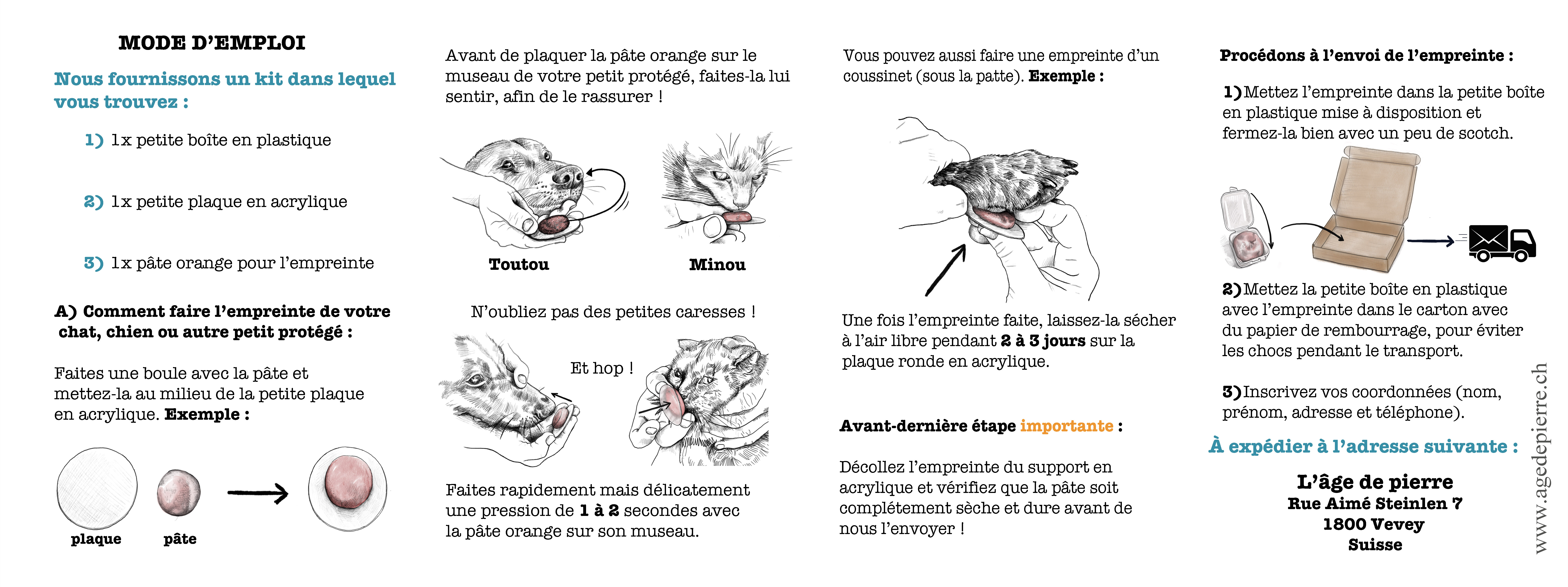 Nous vous envoyons une pâte en terre (inoffensif pour votre petit protégé) et avec les instructions détaillées que vous recevrez avec le kite, vous ferez une empreinte du nez de votre chien. Attendre 3, 4 jours que la pâte sèche pour nous la renvoyer bien protégé dans la boite de renvois avec vos coordonnées le toute à notre adresse de l'âge de pierre.